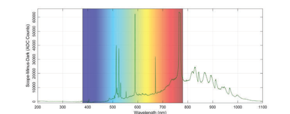 2. 實(shí)驗(yàn)系統(tǒng)與方法 圖1:煙花測(cè)量的實(shí)驗(yàn)系統(tǒng) 實(shí)驗(yàn)系統(tǒng)見圖1。使用的光譜儀為AvaSpec-ULS4096CL-EVO,它配置了4096像素CMOS探測(cè)器,USB3.0通信。使用的光源是由煙花樣品產(chǎn)生的光,其他附件包括光纖和準(zhǔn)直透鏡。 實(shí)驗(yàn)環(huán)境圖 實(shí)驗(yàn)的煙花樣品被點(diǎn)燃后做連續(xù)測(cè)量,每個(gè)樣品大約測(cè)量500次。 我們將實(shí)驗(yàn)樣品放置室外測(cè)量,需要扣除環(huán)境光,所以使用了AvaSoft中的Scope-Minus-Dark(Sd)模式,積分時(shí)間設(shè)置為5ms,平均設(shè)為1。由于本實(shí)驗(yàn)測(cè)量數(shù)據(jù)較多,因此通過軟件中Live Output功能將數(shù)據(jù)保存為Excel和ASCII文件,用于進(jìn)一步的分析和圖形繪制。 3. 實(shí)驗(yàn)結(jié)果與分析 三種煙花樣品均在590nm、660nm和770nm處出現(xiàn)顯著峰(圖2-4)。590nm處的峰為鈉元素,用來為煙花添加黃色來增加它們的整體亮度。660nm和770 nm的峰為木炭中的氫和氧元素峰。其中,770nm的峰也可以歸因于硝酸鉀中的鉀元素,它們都是煙花的必要組成成分。 圖2:紅色煙花樣品的光譜 如圖2所示,紅色煙花樣品在約405 nm,460nm,610nm和670nm處出現(xiàn)了小峰。前兩個(gè)峰405nm和460nm為鍶元素峰,鍶是一種常見的紅色煙花元素添加劑。610nm和670nm的峰為鋰元素峰,另一種用于紅色著色的元素添加劑。 圖3:綠色煙花樣品的光譜 如圖3所示,綠色煙花樣品在500 ~ 550nm以及800 ~ 1000nm出現(xiàn)小峰。其中,553nm處的峰為鋇元素峰,鋇是煙花中最常用的綠色添加劑。 圖4:藍(lán)色煙花樣品的光譜 如圖4所示,藍(lán)色煙花樣品在405nm,435nm, 445nm,515nm和525nm處均出現(xiàn)小峰。405nm峰為鐵元素峰,可以增大煙花的火光。435和445nm的峰為鈣元素峰,用來加深煙花的顏色。515和525nm為銅元素峰,銅是給煙花添加藍(lán)色的主要元素。令人驚訝的是,這兩個(gè)峰也出現(xiàn)在綠色煙花樣品中,其強(qiáng)度明顯高于藍(lán)色煙花樣品。 圖5:紅色煙花(紅色線),綠色煙花(綠色線)和藍(lán)色煙花(藍(lán)色線)樣品的光譜 所有樣品的光譜如圖5所示,銅(515nm和525nm,藍(lán)色)和鈉(590nm,黃色)對(duì)應(yīng)的元素峰在綠色煙花樣品中是最高的,它們結(jié)合在一起時(shí)可以產(chǎn)生綠色,以此證明綠色煙花樣品是由產(chǎn)生藍(lán)色和黃色的火藥結(jié)合起來制作的。 4. 實(shí)驗(yàn)結(jié)論 本實(shí)驗(yàn)成功地判斷了紅藍(lán)綠三種顏色煙花樣品的部分元素組成,每個(gè)元素都有其特定波長(zhǎng)的峰。AvaSpec-ULS4096CL-EVO適合高分辨率和高速測(cè)量應(yīng)用,其分辨率(FWHM)可達(dá)0.05 nm。