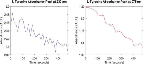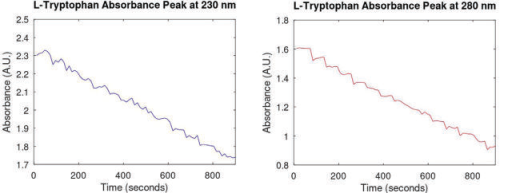 PART02 實(shí)驗(yàn)結(jié)果與分析 兩種氨基酸溶液均出現(xiàn)兩個(gè)顯著的吸光度峰。 圖3:L-酪氨酸溶液在稀釋過(guò)程8分鐘內(nèi) 的吸光度光譜 L-酪氨酸溶液的吸光度峰在波長(zhǎng)230nm和275nm左右(圖3)。 圖4:L-色氨酸溶液在稀釋過(guò)程15分鐘內(nèi) 的吸光度光譜 L-色氨酸溶液的吸光度峰在波長(zhǎng)230nm和280nm左右(圖4)。 圖5:測(cè)量過(guò)程中L-酪氨酸溶液的吸光度 峰值(230nm和275nm)隨時(shí)間的變化 圖6:測(cè)量過(guò)程中L-色氨酸溶液的吸光度 峰值(230nm和280nm)隨時(shí)間的變化 正如預(yù)期的那樣,稀釋會(huì)導(dǎo)致兩種溶液的吸光度峰值下降,其中,L-酪氨酸(圖5)峰值的下降幅度比L-色氨酸(圖6)峰值的下降幅度更小。 PART03 實(shí)驗(yàn)結(jié)論 本實(shí)驗(yàn)動(dòng)態(tài)測(cè)量了流動(dòng)的氨基酸溶液稀釋時(shí)的吸光度峰值變化。測(cè)量得到的L-酪氨酸和L-色氨酸溶液的吸光度峰值波長(zhǎng)與文獻(xiàn)報(bào)道中的一致。在整個(gè)稀釋操作過(guò)程中,峰值的大小都如預(yù)期的那樣下降。