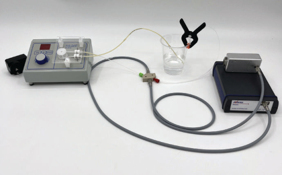 本實(shí)驗(yàn)旨在測(cè)量氨基酸在溶液中的吸光度,并在溶液緩慢稀釋的過(guò)程中監(jiān)測(cè)它們的吸光度峰值變化。如圖一所示,實(shí)驗(yàn)中使用的氨基酸為L-酪氨酸和L-色氨酸,將這兩種氨基酸放于純水(去離子水)中稀釋。為了確保實(shí)驗(yàn)不間斷測(cè)量,我們使用了流動(dòng)樣品池和蠕動(dòng)泵。 圖1:本實(shí)驗(yàn)測(cè)量的氨基酸溶液樣品,包括L-酪氨酸溶液(左)和L-色氨酸溶液(右) 實(shí)驗(yàn)中選擇的氨基酸為L(zhǎng)-酪氨酸和L-色氨酸,它們被歸類為芳香族氨基酸。在這種情況下,術(shù)語(yǔ)“芳香”不是指氣味,而是指具有平面或接近平面環(huán)狀結(jié)構(gòu)的有機(jī)化合物。這些氨基酸通??梢酝ㄟ^(guò)獨(dú)特的雙鍵來(lái)識(shí)別。這一組氨基酸的光譜特性很有趣,因?yàn)樗麄儾晃湛梢?jiàn)光范圍內(nèi)的光,卻吸收紫外范圍內(nèi)的光。 實(shí)驗(yàn)中使用流動(dòng)樣品池和蠕動(dòng)泵測(cè)量。流動(dòng)樣品池用來(lái)將光源和光譜儀固定,使溶液在一定距離之間通過(guò)。這種實(shí)驗(yàn)配置適配多種應(yīng)用,常見(jiàn)的如血液分析。