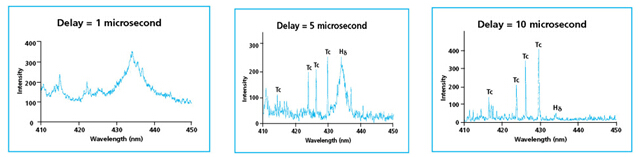 在測量時要使用帶門控的探測器來記錄激光脈沖延遲一段時間后所產(chǎn)生的激光等離子體的光輻射,這是由于只有在等離子體已經(jīng)膨脹并開始冷卻時才會出現(xiàn)原子或者離子的特征輻射譜線。下面的光譜圖中展示了在不同的探測器采樣時間延遲下得到的锝的特征輻射譜線。