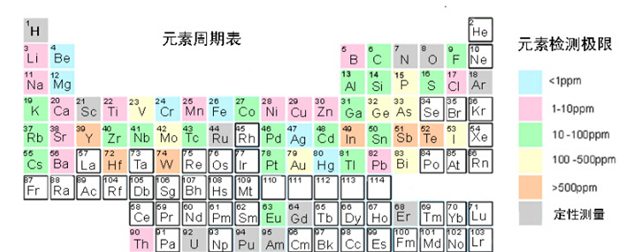 對LIBS系統(tǒng)進行定標后就可以對基體材料中的微量元素進行定量分析,比如分析鋼材中的鉻、鋁合金中的鎂、玻璃中的鐵、硫酸銅中的銅等。定標時要使用經(jīng)過鑒定的樣品材料,這個樣品材料與被測材料具有相同的基體,但含有不同含量的被分析元素。在分析時通常采用所謂的“內部標準化”的過程,即把被分析元素的譜線強度和基體材料的譜線強度進行比較,這樣就可以減少由于激光的脈沖能量不一致性所導致的等離子體條件變化對測量結果的影響。要想得到好的分析結果就要對LIBS的硬件進行仔細的設計并采用合適的測量方法。LIBS系統(tǒng)測量的靈敏度與許多因素有關:被分析物和基體材料的結合方式, LIBS系統(tǒng)和被測樣品的距離,以及是否需要遙測等。LIBS系統(tǒng)測量結果的正確性可優(yōu)于10% ,精度可優(yōu)于5%。不同元素的典型檢測限請參閱下面的元素周期表。