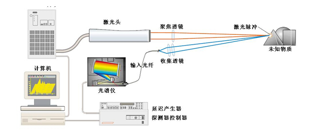 在如此之高的激光功率密度作用下,被測材料表面就會有幾微克的物質被噴射出來,這個過程通常被稱為激光剝離,同時材料表面還會產(chǎn)生壽命很短但亮度很高的等離子體,其瞬間溫度可達10,000℃。在這個熱等離子體中,噴射出來的物質離解成激發(fā)態(tài)的原子和離子。在激光脈沖結束后,由于等離子體以超音速向外擴展所以迅速地冷卻下來。在這段時間內,處于激發(fā)態(tài)的原子和離子從高能態(tài)躍遷到低能態(tài),并發(fā)射出具有特定波長的光輻射。用高靈敏度的光譜儀對這些光輻射進行探測和光譜分析分析,就可以得到被測材料的元素構成信息。