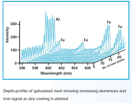 由于激光可以以一種可控的方式來清除表面涂層,因此分層結構的深度輪廓分析可以用LIBS技術來進行。 在激光不斷“鉆入”到被測材料中的同時用光譜儀對其產(chǎn)生的光輻射進行光譜測量,就可以得到被測材料的構成成分元素隨深度變化的函數(shù)。通常這一技術只能用于那些在典型LIBS系統(tǒng)中激光器的參數(shù)下比較容易去除的材料。比如在鋼材上鋅鍍的過程控制中的成分分析,探測油漆中的重金屬(鉛、鈾、钚等),檢測混凝土的成分污染等。