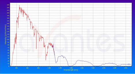 該系統(tǒng)配備太陽(yáng)追蹤模塊和光學(xué)采集模塊,可以根據(jù)GPS信息自動(dòng)采集太陽(yáng)光譜輻照度。下圖為本系統(tǒng)獲取的300-2500nm波段的太陽(yáng)光譜。