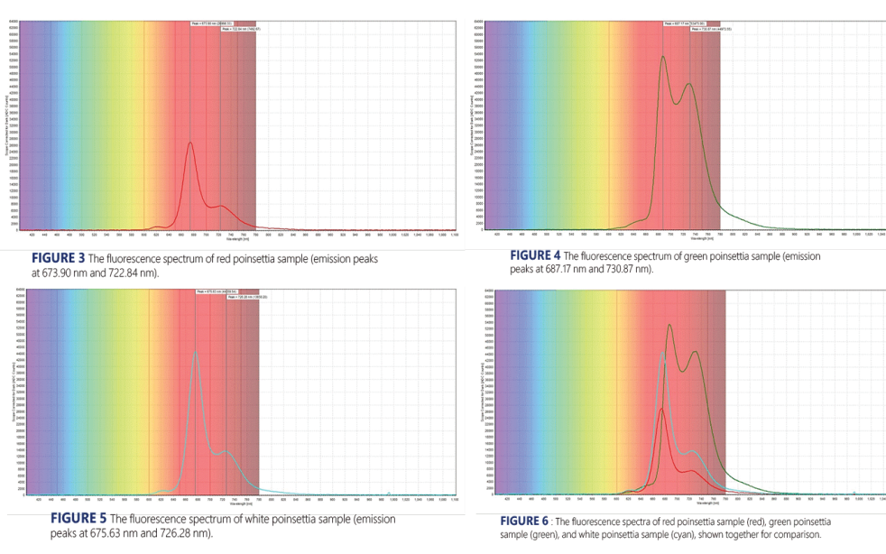 圖為紅色一品紅樣品(紅色線(xiàn))、綠色一品紅樣品(綠色線(xiàn))和白色一品紅樣品(藍(lán)色線(xiàn))的熒光光譜比較。為了直接比較每個(gè)樣品的葉綠素含量,計(jì)算735 nm和700nm峰值的比。紅葉樣本,兩個(gè)峰的比值為7492.67/26998.33,等于0.278。對(duì)于綠葉樣本,比值為44973.55/53473.00,即0.841。白葉樣本的比值為13650.20/44659.54,即0.306。