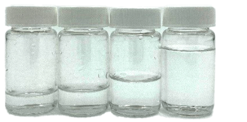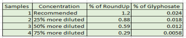 如圖3,農達除草劑的稀釋推薦配比為:1.5盎司(3湯匙)農達除草劑與1加侖水混合,此時農達除草劑樣品的濃度約為1.2%。在溶質重量保持不變的情況下,其他三種樣品分別比推薦濃度多稀釋了25%,50%和75%。(此濃度是根據(jù)其他三種濃度確定,這三種樣品的濃度分別比推薦濃度稀釋率高25%、50%和75%。) 圖3:稀釋后農達除草劑樣品的濃度和百分比 溶劑是去離子水,用來稀釋草甘膦含量為2%的農達溶液,稀釋后得到四種樣品濃度分別為1.2%、0.88%、0.59%和0.29%(圖3)。這四種樣品中草甘膦百分比分別為0.024%、0.018%、0.012%和0.0058%(圖3)。稀釋后的四種樣品如圖4所示。 圖4:稀釋后4種不同濃度的農達除草劑溶液