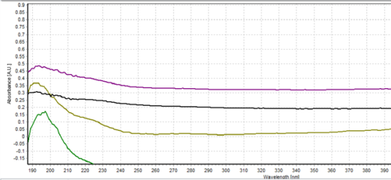 5mm光程探頭測量光譜的一致性不如10mm探頭的測量光譜。樣品2(紫色,稀釋程度增加25%)和樣品4(黑色,稀釋程度增加75%)的光譜形狀與其他兩個樣品不一樣。并且樣品2和樣品4的吸光度譜線達到峰值后并沒有迅速降低,而是并未真正下降。這些結果證明,5mm光程探頭的測量結果不如10mm光程探頭的測量結果可靠。這與我們最初的假設一致:因為四個樣品都被充分稀釋,所以10mm光程探頭可以得到更好的測量結果。 使用5mm/10mm光程探頭測量 農達溶液的吸光度 圖7:使用5mm/10mm光程探頭測量適宜濃度溶液 使用5mm/10mm光程探頭測量 農達溶液的吸光度 圖8:使用5mm/10mm光程探頭測量稀釋度增加25%的溶液 使用5mm/10mm光程探頭測量 農達溶液的吸光度 圖9:使用5mm/10mm光程探頭測量稀釋度增加50%的溶液 使用5mm/10mm光程探頭測量 農達溶液的吸光度 圖10:使用5mm/10mm光程探頭測量稀釋度增加75%的溶液 使用5mm/10mm光程探頭測量 農達溶液的吸光度 圖11:使用5mm/10mm光程探頭測量的所有結果 圖7、8、9和10對比了每個樣品的10mm光程探頭和5mm光程探頭的測試結果??梢钥吹绞褂?0mm光程探頭的5mm光程探頭的測量結果更準確。圖11是本實驗的所有光譜結果匯總。
