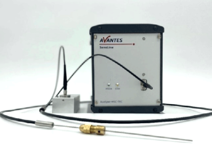 圖1:實驗系統(tǒng) AvaSpec-HERO光譜儀、AvaLight-XE高功率脈沖氙燈和可變光程浸入式探頭 實驗中,我們使用了Avantes公司的科研級紫外/可見光譜儀AvaSpec-HERO(圖1)。AvaSpec-HERO光譜儀基于高靈敏度緊湊型光學平臺(焦距=100mm,數(shù)值孔徑=0.13)以及一塊1024×58 像素的背照式CCD 探測器,它擁有很高靈敏度和分辨率。AvaSpec-HERO采用先進的AS7010電路板,它包括一個高性能AD轉換器,具有高信噪比和動態(tài)范圍,USB3.0和以太網(wǎng)接口可以實現(xiàn)高速通信。由于本實驗在紫外范圍內需要較高的靈敏度,所以我們使用了這種光譜儀。 光源采用脈沖氙燈AvaLight-XE-HP,它在極紫外區(qū)域有非常好的表現(xiàn),并通過一根Y型觸發(fā)線與光譜儀連接。它接收到光譜儀的TTL信號后開始工作,以確保僅在光源工作時測量光譜。每次測量的閃光次數(shù)可以在AvaSoft軟件中設置,以避免光譜飽和(當過量的光進入光譜儀時會產(chǎn)生飽和現(xiàn)象)。我們在10mm光程長度實驗中將閃光次數(shù)設置為3次,在5mm光程長度實驗中將閃光次數(shù)設置為2次。 圖2 :光程長度為10mm時的可變光程浸入式探頭 實驗系統(tǒng)中的最后一個組件是Avantes公司的可變光程浸入式探頭。Avantes公司為科研及工業(yè)客戶提供了固定或可變光程長度的浸入式探頭 (圖2),光程長度的改變可以通過銅管件的旋松并擰緊實現(xiàn)的。較長的光程長度適用于測量低濃度樣品,較短的光程長度適用于測量高濃度樣品。這是因為更長的距離允許更多的光進入樣品,光程長度為10mm的探頭比5mm長度更適用于較低濃度的樣品。