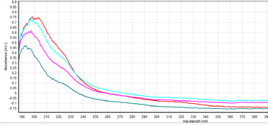 測試樣品前,我們設置光譜儀的積分時間為30ms,AvaLight-XE-HP光源的閃光次數(shù)為3次。我們首先使用10mm光程長度測試了四個樣本,我們選擇吸光度模式,先存儲暗噪聲來消除儀器自帶的噪聲,以溶劑(去離子水)作參考。使用10mm光程長度探頭的吸光度測量結果如圖5所示。 圖5: 使用10mm光程長度探頭的吸光度測量結果 純草甘膦的吸光度峰在265 nm左右,而稀釋后的草甘膦吸光度峰可位于200 ~ 300nm的任意波長處。我們在實驗中測得的峰在200nm左右,光譜形狀也與其他研究者的光譜數(shù)據(jù)一致。因此可以證明,使用10mm光程長度的探頭可以很好地測量四種農達除草劑稀釋溶液中的草甘膦。 圖6: 使用5mm光程長度探頭的吸光度測量結 第二次實驗使用的是5mm光程長度探頭,我們設置光譜儀的積分時間為20ms,AvaLight-XE-HP光源的閃光次數(shù)為2次,這樣做是為了避免出現(xiàn)飽和情況,測量結果如圖6.