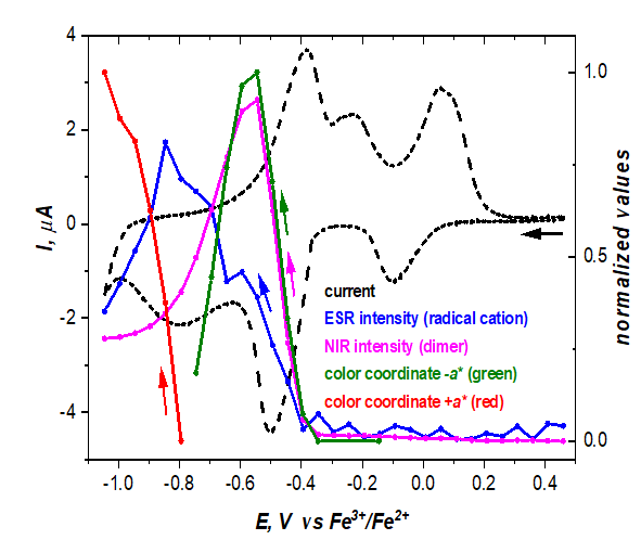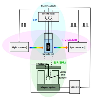 電子自旋(順磁)共振(ESR/EPR) 光譜是檢測(cè)和表征含有未配對(duì)電子的結(jié)構(gòu)(例如有機(jī)自由基、過渡金屬離子)的方法。中性有機(jī)分子中電子轉(zhuǎn)移的主要步驟導(dǎo)致自由基離子的形成,這可以通過 ESR 光譜明確證實(shí)。第二次電子轉(zhuǎn)移通常導(dǎo)致抗磁結(jié)構(gòu)。紫外-可見-近紅外光譜提供有關(guān)順磁性和反磁性物質(zhì)的光學(xué)特性的信息。