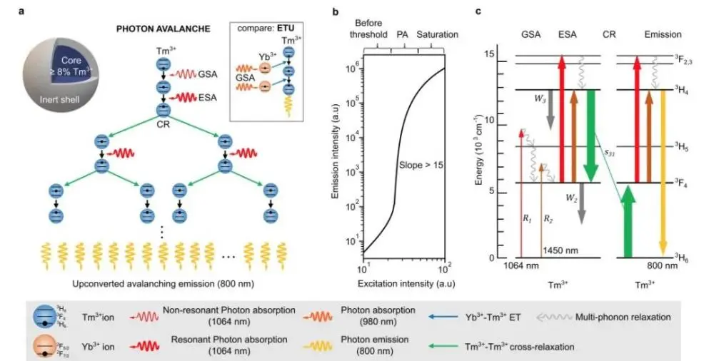 哥倫比亞工程研究人員已經(jīng)在納米顆粒中實(shí)現(xiàn)的光子雪崩機(jī)理反應(yīng)過程圖示。